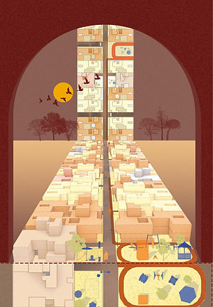 [Image 6] Plug-ins at the macro scale that connect residential clusters through a central area by walking loops, activity nodes, and the participation of all genders and age groups.